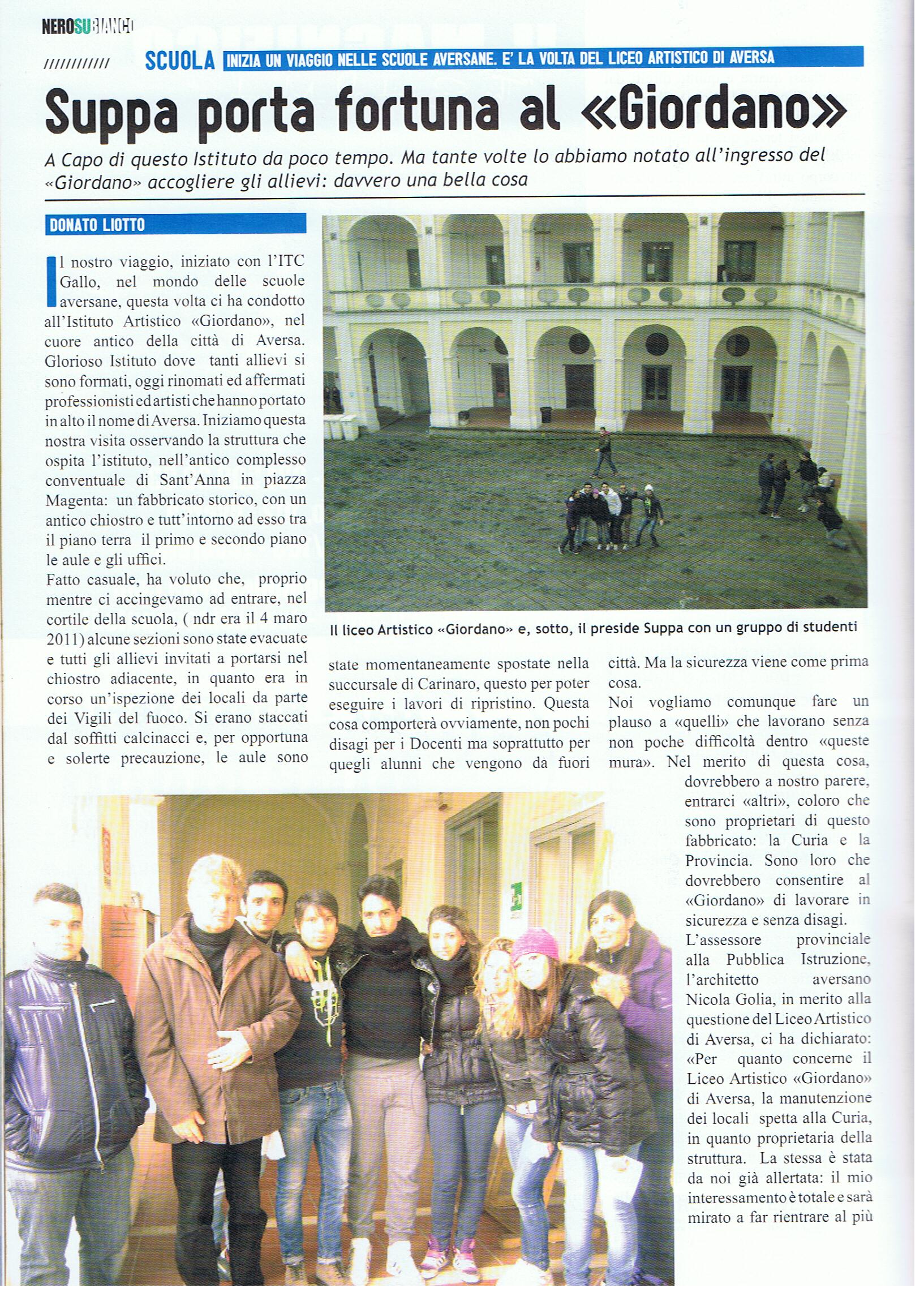 Per i Dirigenti, per i Professori e per il personale ATA , ma vogliamo soprattutto dire, per gli allievi, operare, lavorare in questa storica struttura è davvero difficile, ma abbiamo anche constatato, che da parte di tutti, c’è grande impegno a continuare a lavorare e portare avanti ciascuno il proprio compito. Noi, non vogliamo entrare nei particolari di questi “disagi” dati da un’immobile, che certamente va adeguato in modo consono all’uso a qui è destinato, vale a dire :ospitare una scuola. Ma vogliamo comunque fare un plauso a “quelli” che lavorano, e questo lo ribadiamo, senza non poche difficoltà dentro “queste mura” garantendo una continuazione sia dei progetti sia del buon funzionamento della scuola. Nel merito di questa cosa, dovrebbero a nostro parere, entrarci “altri” coloro, che sono proprietari di questo fabbricato: La Curia, e subito dopo la Provincia. Sono loro, che dovrebbero consentire a tutti del “Giordano” di lavorare in sicurezza e senza disagi, una struttura degna del nome che ospita questo importante istituto aversano. A tal proposito all’epoca dei fatti interpellammo anche l’Assessore Provinciale alla Pubblica Istruzione l’Architetto Nicola Golia in merito alla questione del Liceo Artistico “Giordano di Aversa” il quale ci fece questa dichiarazione: “Per quanto concerne il Liceo Artistico “Giordano” di Aversa, la manutenzione dei locali spetta alla Curia , in quanto proprietaria, la stessa è stata da noi già allertata , in alcuni locali, in questi giorni, ci sono stati dei distacchi di intonaco, già stiamo provvedendo a sistemarli, in tempi celerissimi, il mio interessamento è totale e mirato a far rientrare al più presto le classi spostate nelle succursale di Carinaro provvisoriamente.”, conoscendo l’impegno dell’Assessore Golia, siamo certi che a quest’ora il problema sia già bello che risolto. Solo il fatto, di avere una scuola come questa, ospite in questo fabbricato, dovrebbe di rimando, dare lustro e soddisfazione e inorgoglire chi li ospita. Noi vogliamo dire ai futuri alunni di questo Istituto, di continuare a iscriversi per il prossimo anno e di continuare questa tradizione, che viene soprattutto attraverso l’affermazione dei suoi allievi, e questo, grazie anche, alla professionalità dei docenti e dei dirigenti , che con voglia ed entusiasmo continuano a formare tante giovani promesse. A Capo di questo Istituto e da poco tempo, il Preside Prof. Luigi Suppa, egli proviene da Caserta, noi tante volte lo abbiamo notato di mattina presto all’ingresso del Giordano accogliere gli allievi, cosa questa che avveniva tanti anni fa, dobbiamo dire che questa è davvero una cosa piacevole, è bello per gli allievi di buon mattino essere accolti dal proprio dirigente , questo crea senz’altro un riscontro positivo tra le parti. Da qui inizia la nostra intervista al Preside Luigi suppa. La prima domanda che vorremmo porle è la seguente: Lei è da poco tempo a capo di questo Istituto, ci vuole dare una sua impressione, il suo impatto con questa realtà e il suo inserimento in un contesto per Lei del tutto nuovo?-